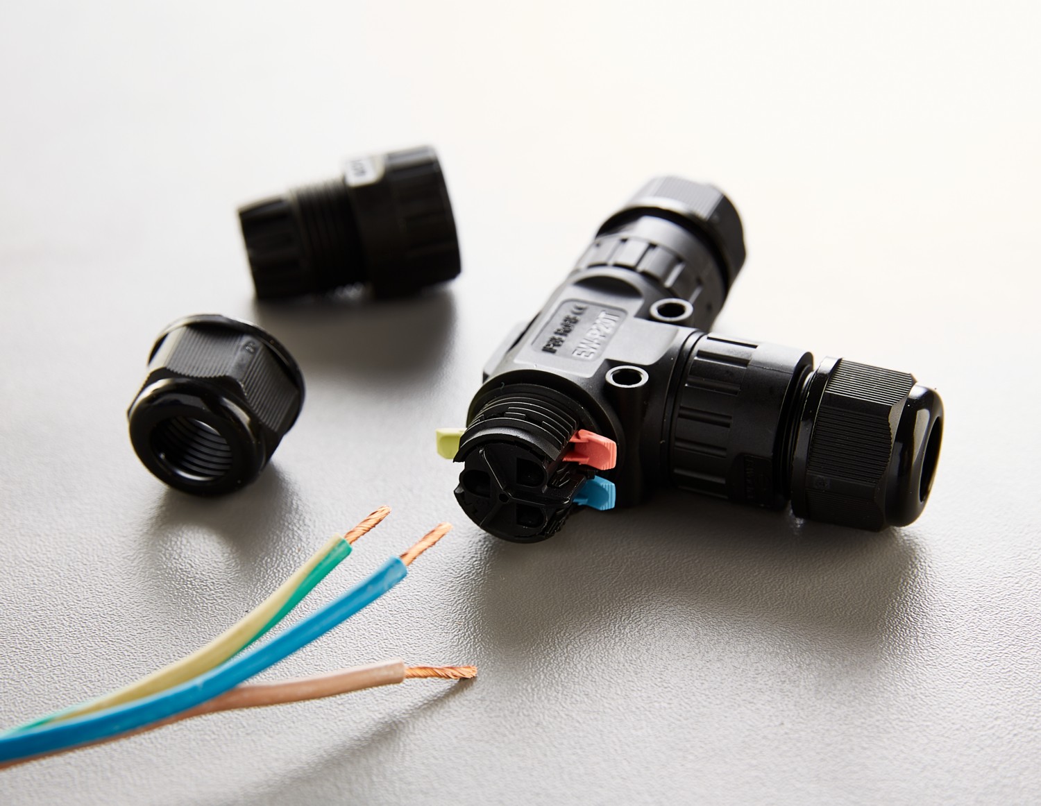 Kabelverbinder für den dauerhaften Einsatz im Außenbereich mit schraubenlosen Klemmen für massive oder feindrähtige (ohne Aderendhülsen) Leiter geeignet