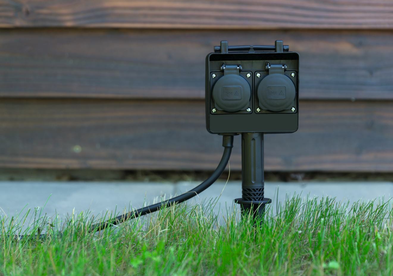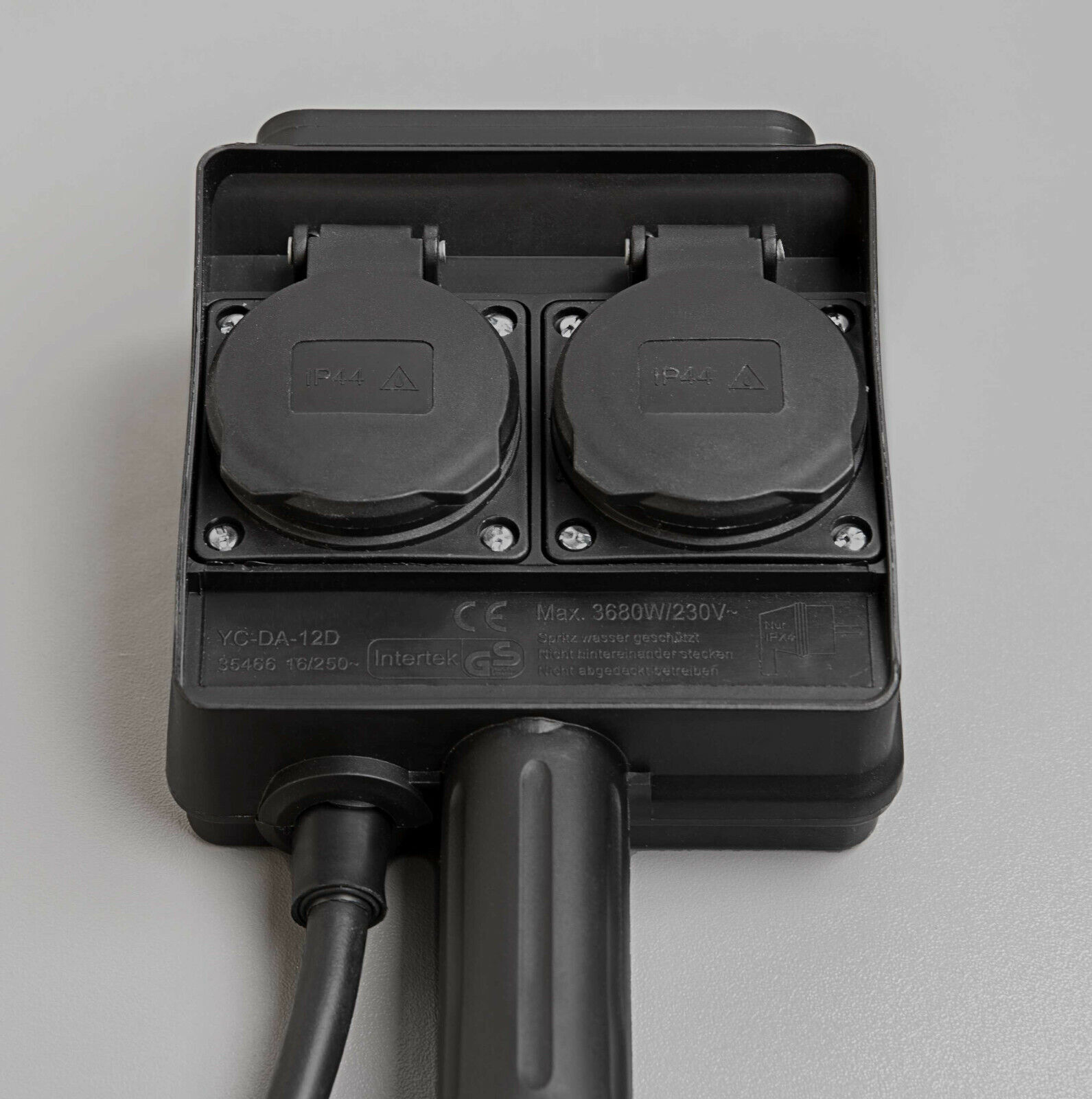 - Mit 2 Steckdosen mit Schutzklappe (Federklappdeckel)