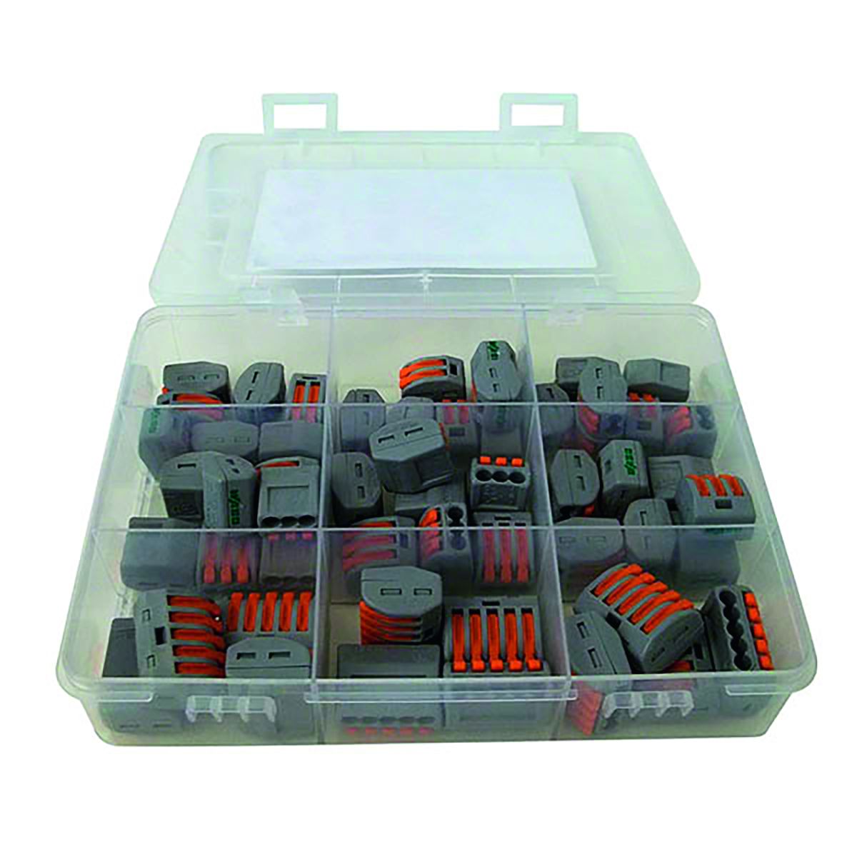 Wago Sortimentsbox 7 mit 54 Wagoklemmen transparent/orangeBestehend aus
