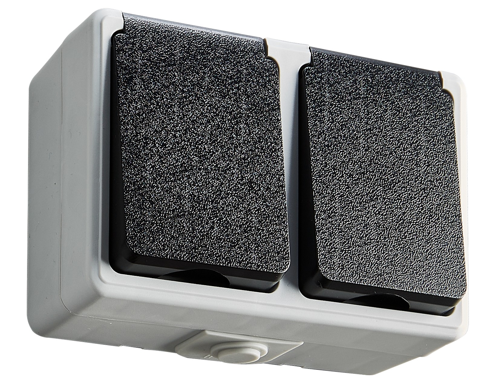 Aufputz-Feuchtraum-Steckdose aus der Serie MONSUN Wippschalter grau